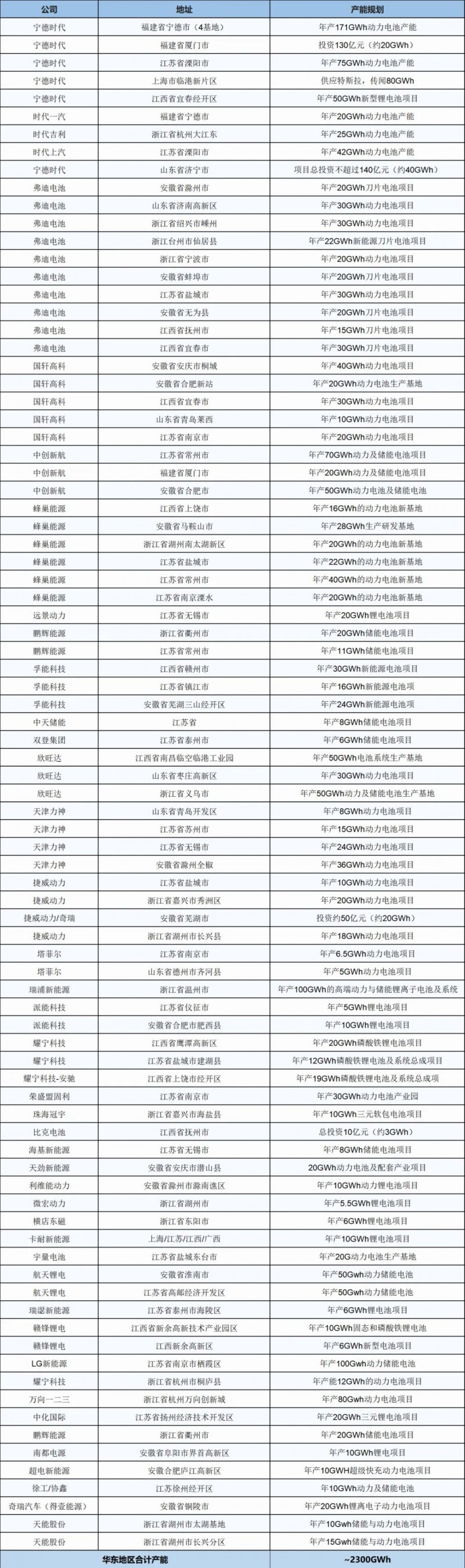 從地域來看:華東區域規劃動力和儲能電池超2300GWh,華中和華南地區規劃動力及儲能電池超1200GWh,西北和西南地區規劃動力及儲能電池超1100GWh,海外、華北及東北地區規劃動力及儲能電池超500GWh。