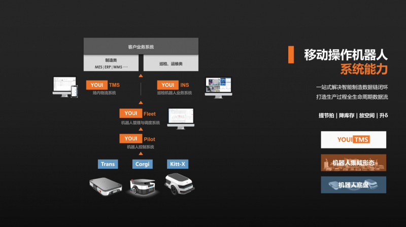 優(yōu)艾智合是國內(nèi)最早布局軟件系統(tǒng)的移動機器人企業(yè)。以針對制造業(yè)打造的YOUI TMS智慧物流系統(tǒng)為例,其能將移動機器人在工序間的物理流轉升級為數(shù)據(jù)連接,具備根據(jù)ERP、WMS、MES等企業(yè)信息系統(tǒng)進行整體物流自主調(diào)度的能力,完成備料倉到產(chǎn)線再至成品倉的物流數(shù)據(jù)全覆蓋。