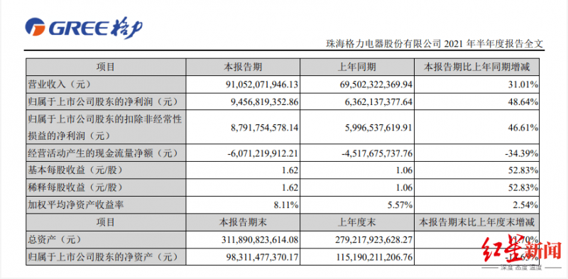 根據格力電器發布其2021年上半年財報顯示,2021年上半年,格力實現營收911億元,同比增長31%。主營收入為709.32億元,同比增長42.69%。利潤總額 109.76億元,42.62%;實現歸屬于上市公司股東的凈利潤94.57億元,同比增長48.64%。基本每股收益1.62元,同比增長52.83%。其中,2021上半年格力智能裝備收入為1.98億元,同比減少5.44%,占比總營收 0.22%。